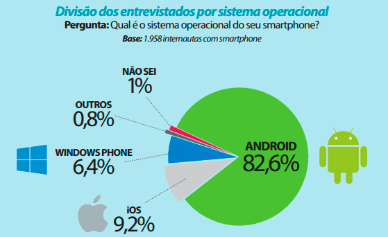De acordo com o NetMarketShare, o Windows Phone ficou com uma fatia de 4,03% dos usuários de smartphones no mundo em abril. A pesquisa da Mobile Time, realizada no mesmo período, detectou que 6,4% dos brasileiros que possuem um telefone inteligente utilizam o sistema da Microsoft. O Android domina o mercado brasileiro com 82,6% dos usuários, enquanto o iOS possui 9,2%. No mundo, o robozinho ficou com 61,9% e a Maçã, com 28,4% em abril.